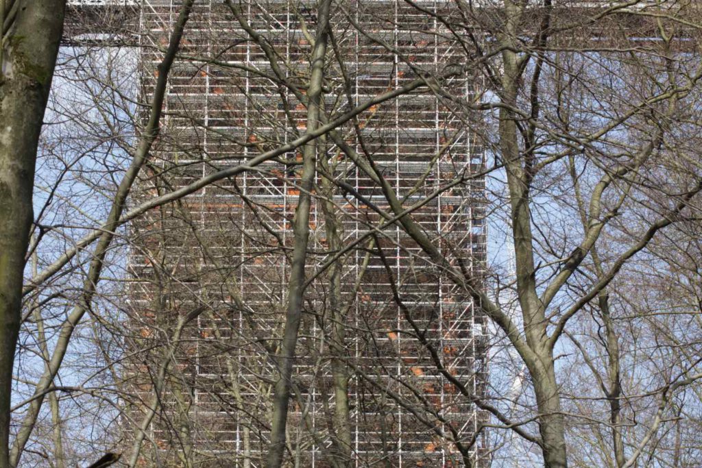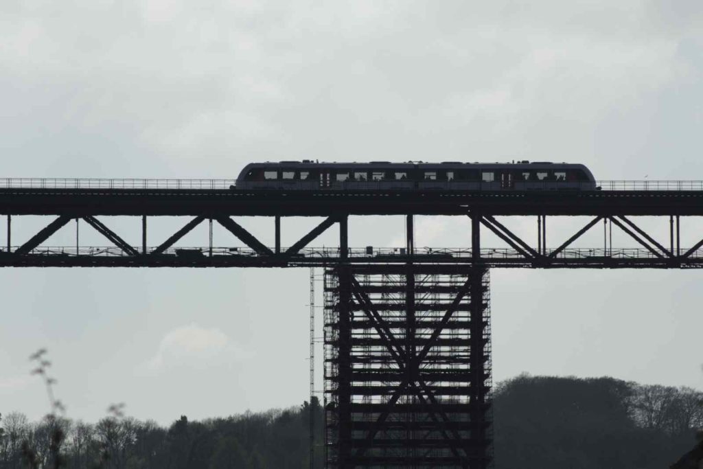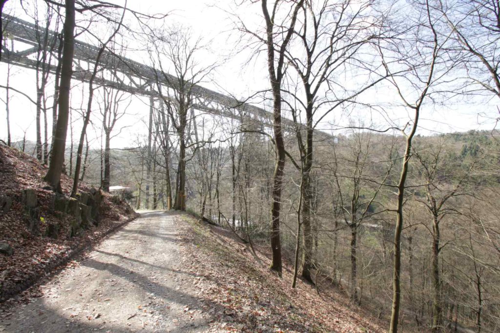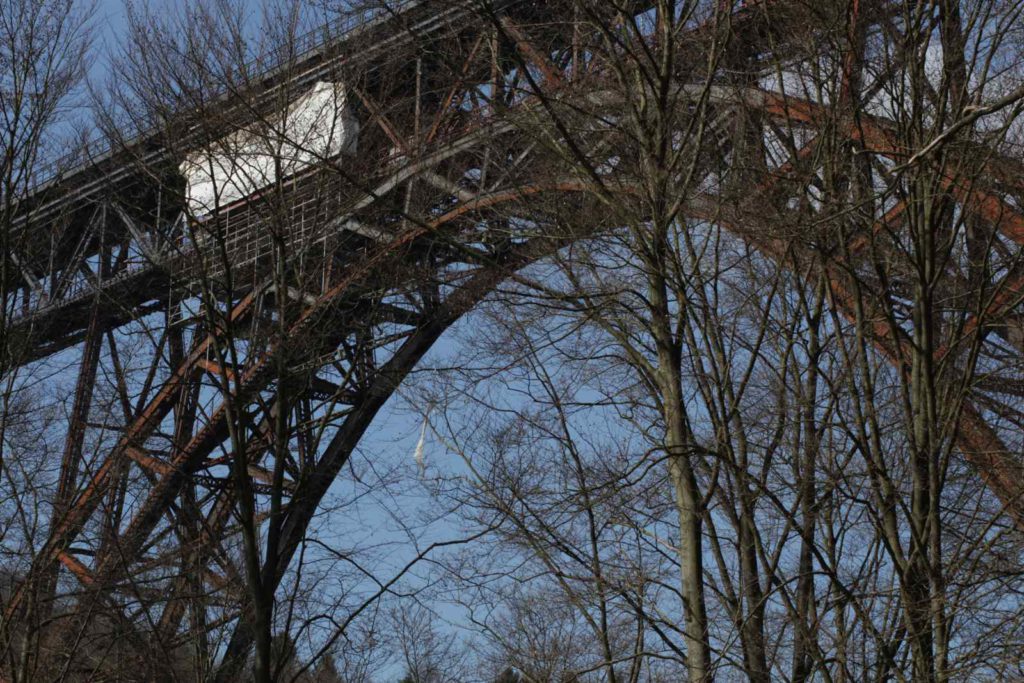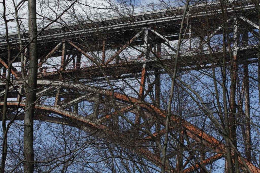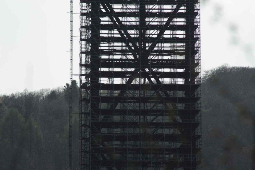 Die Müngstener Brücke ist die höchste Eisenbahnbrücke Deutschlands. Sie überspannt zwischen den Städten Remscheid und Solingen in 107 Metern Höhe das Tal der Wupper. Zurzeit finden umfangreiche Sanierungsarbeiten an der Stahlkonstruktion statt, weswegen die Stützpfeiler teilweise komplett eingerüstet sind.