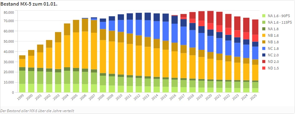 Der Bestand an MX-5 von 1999 bis 2025